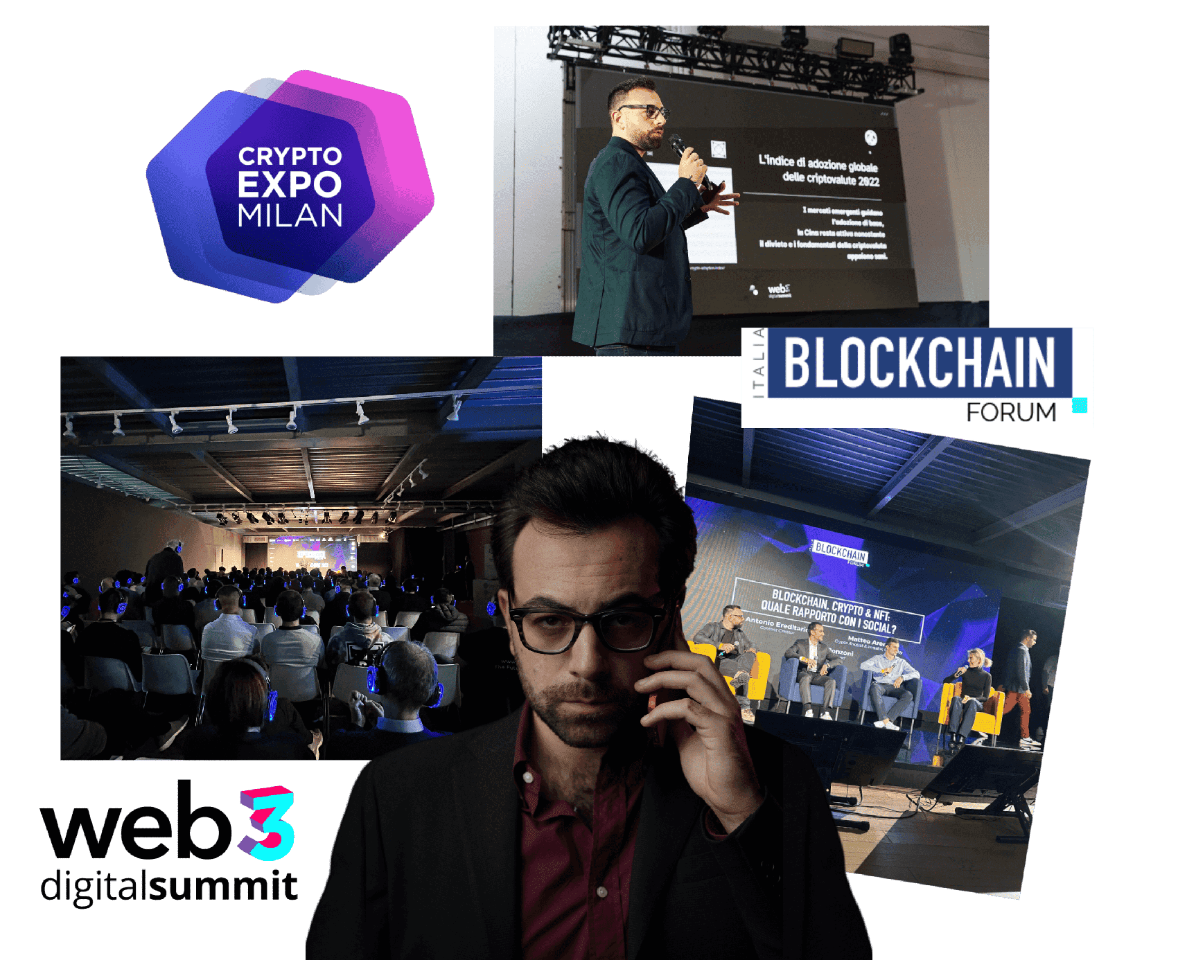 Sono invitato come speaker ai principali eventi blockchain nazionali come il Web3 Digital Summit, Blockchain Forum Milan, Blockchain week Rome, Cr. Expo Milan, e sono stato intervistato anche da Radio RTL 102.5